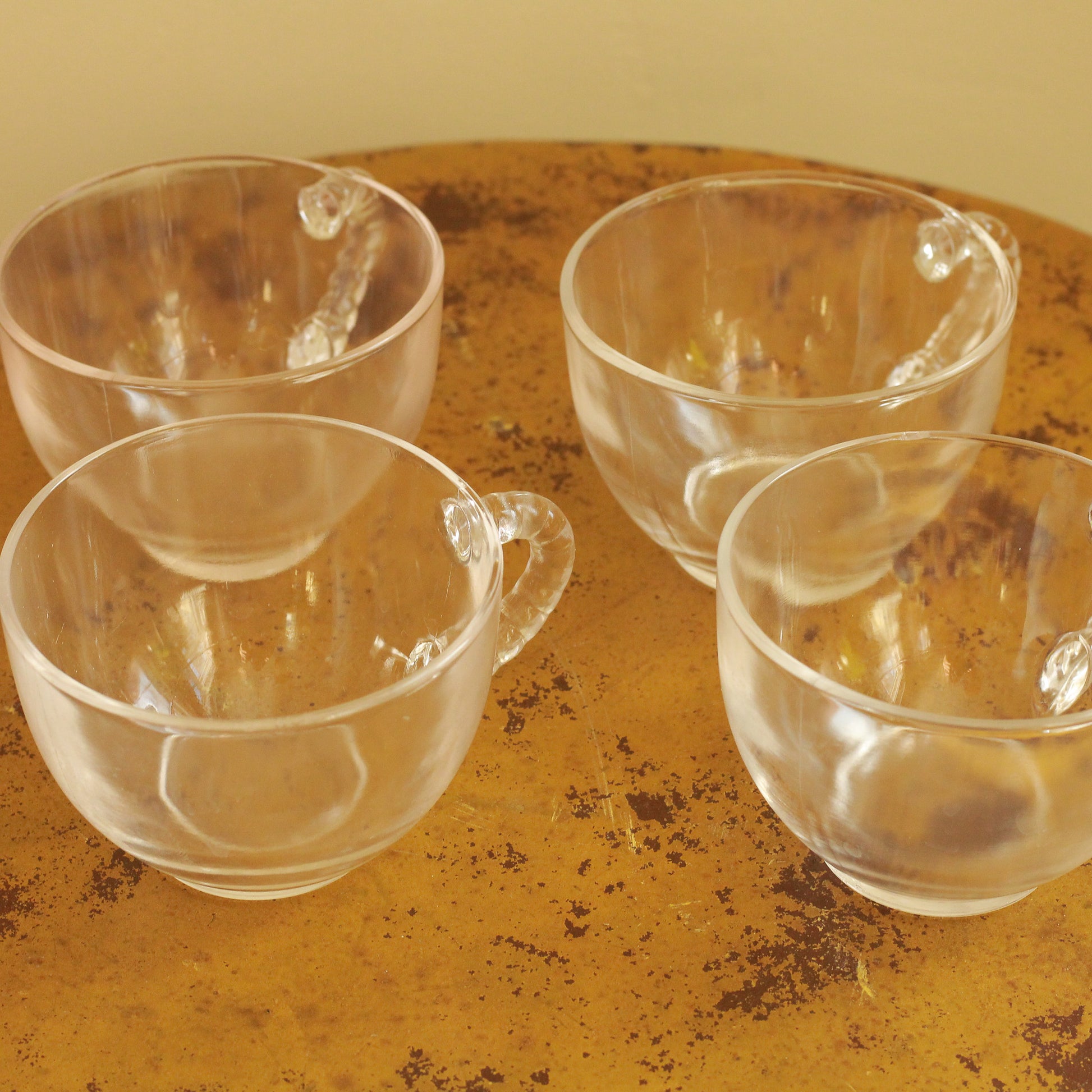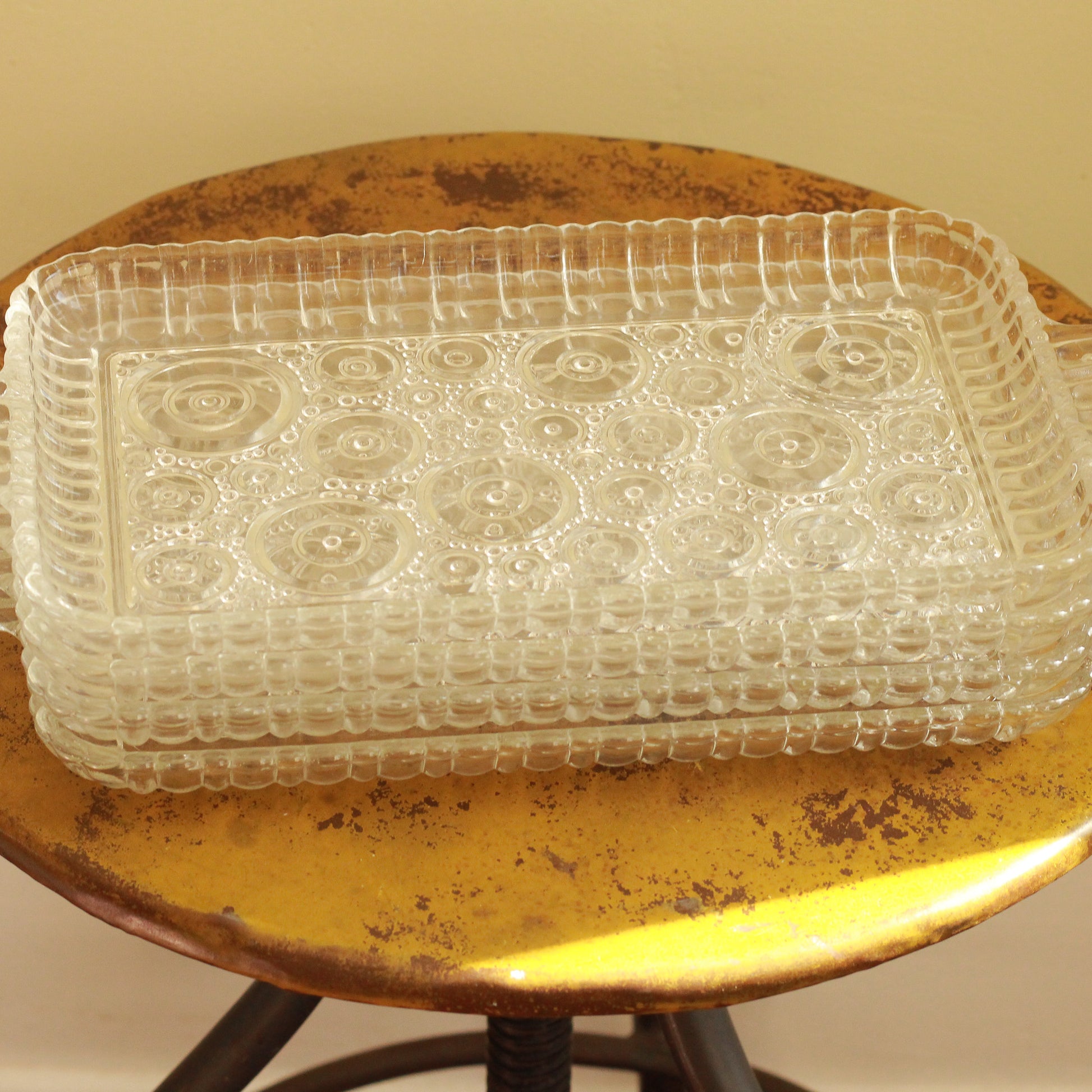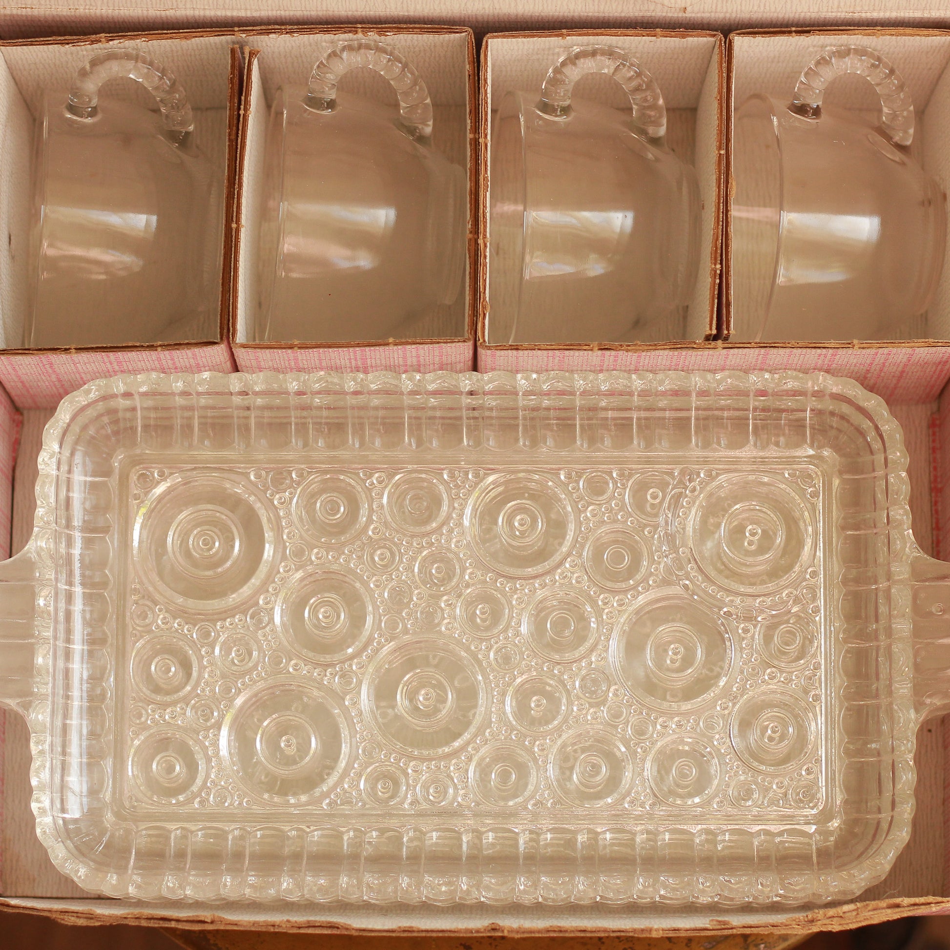 This charming Anchorglass Serva Snack Set includes 4 serving trays and 4 cups, along with the original box. The plates have a round bubble pattern. Great condition although box does have wear.