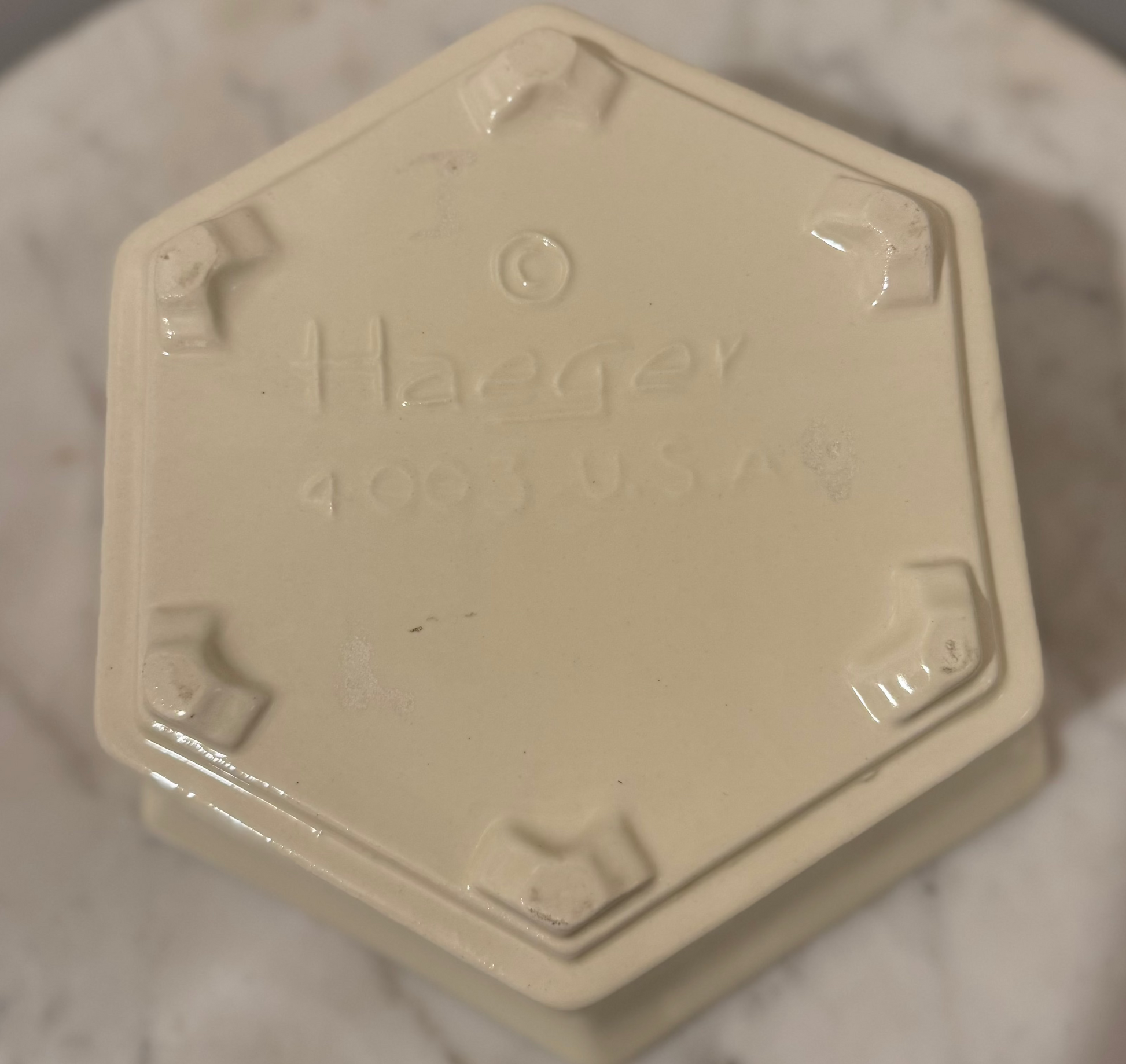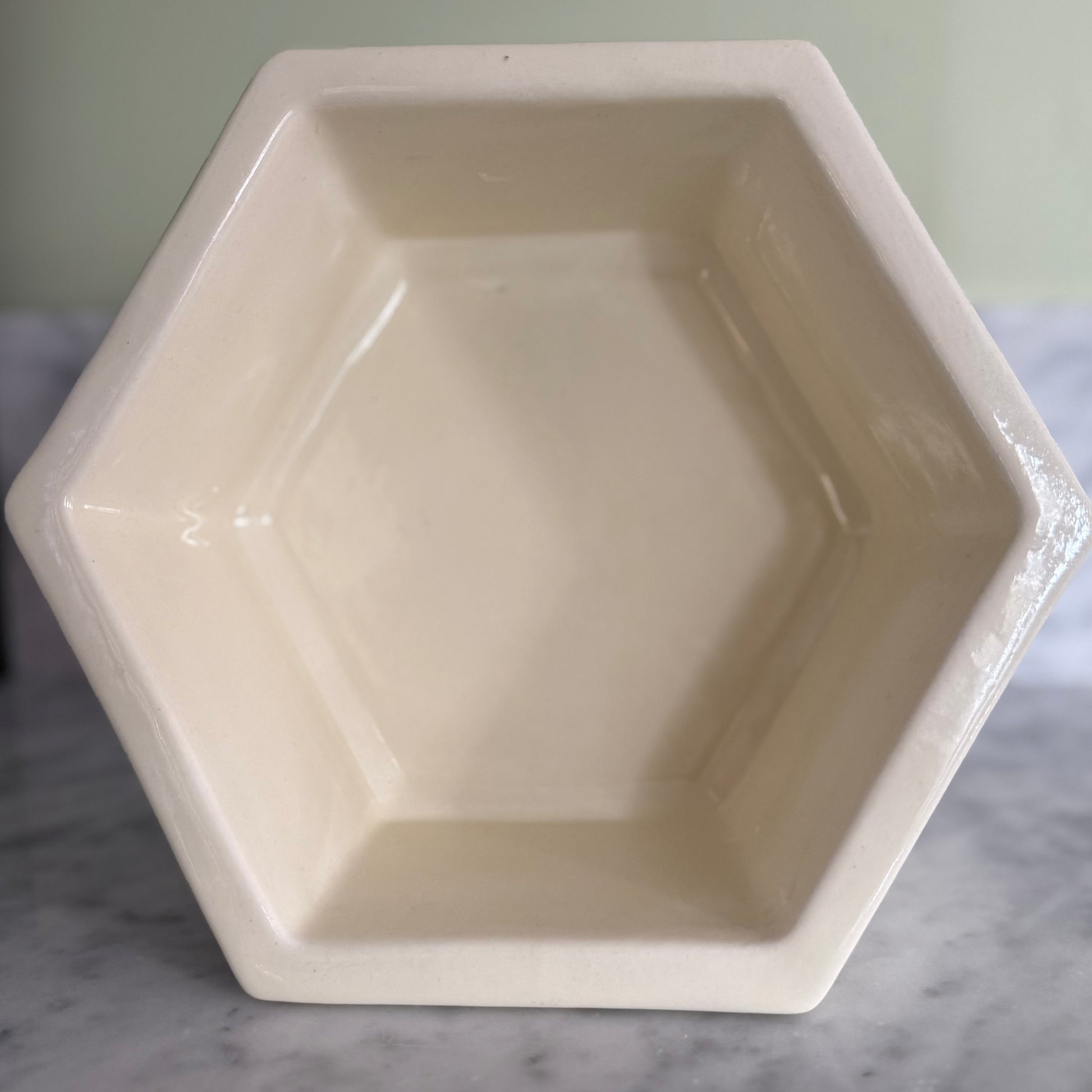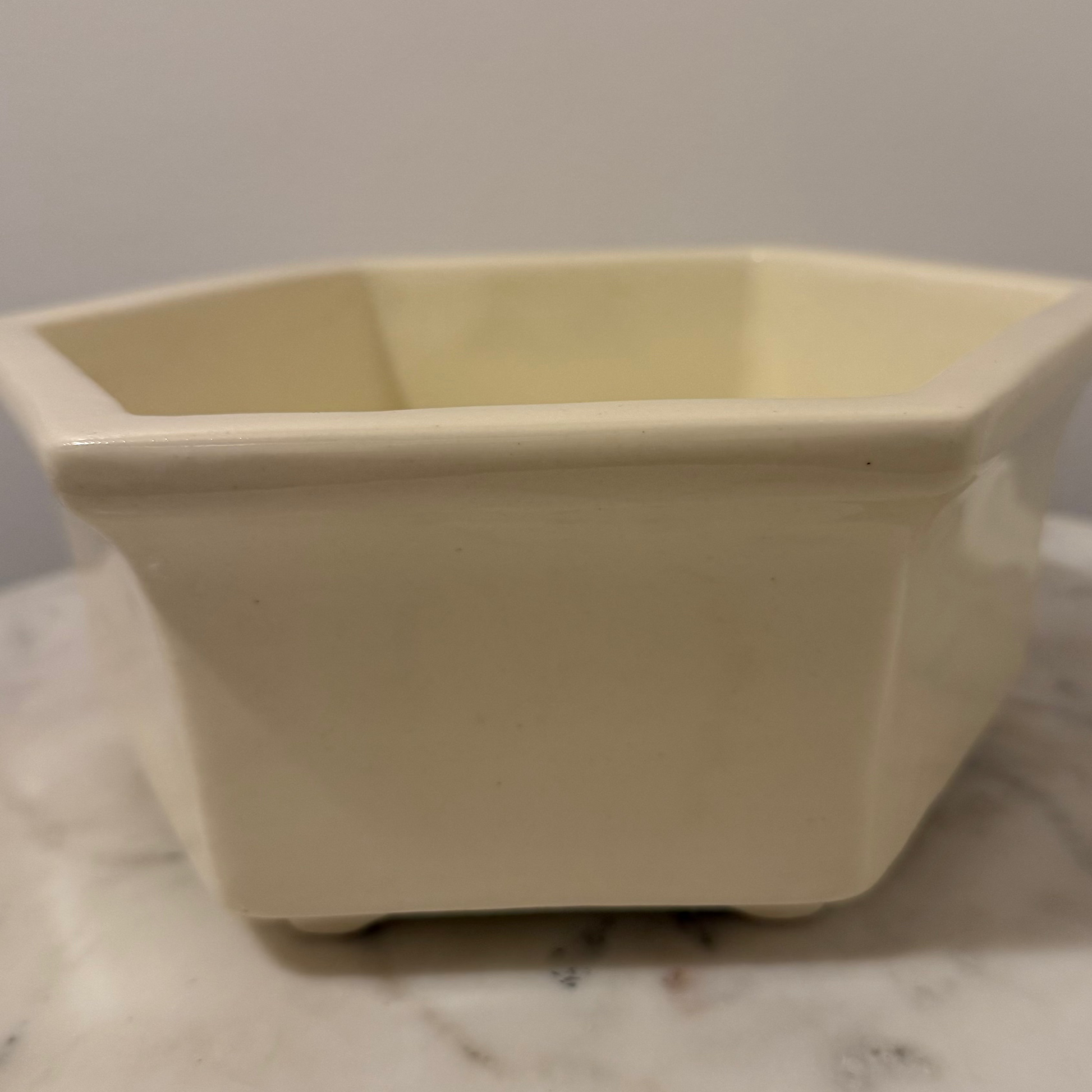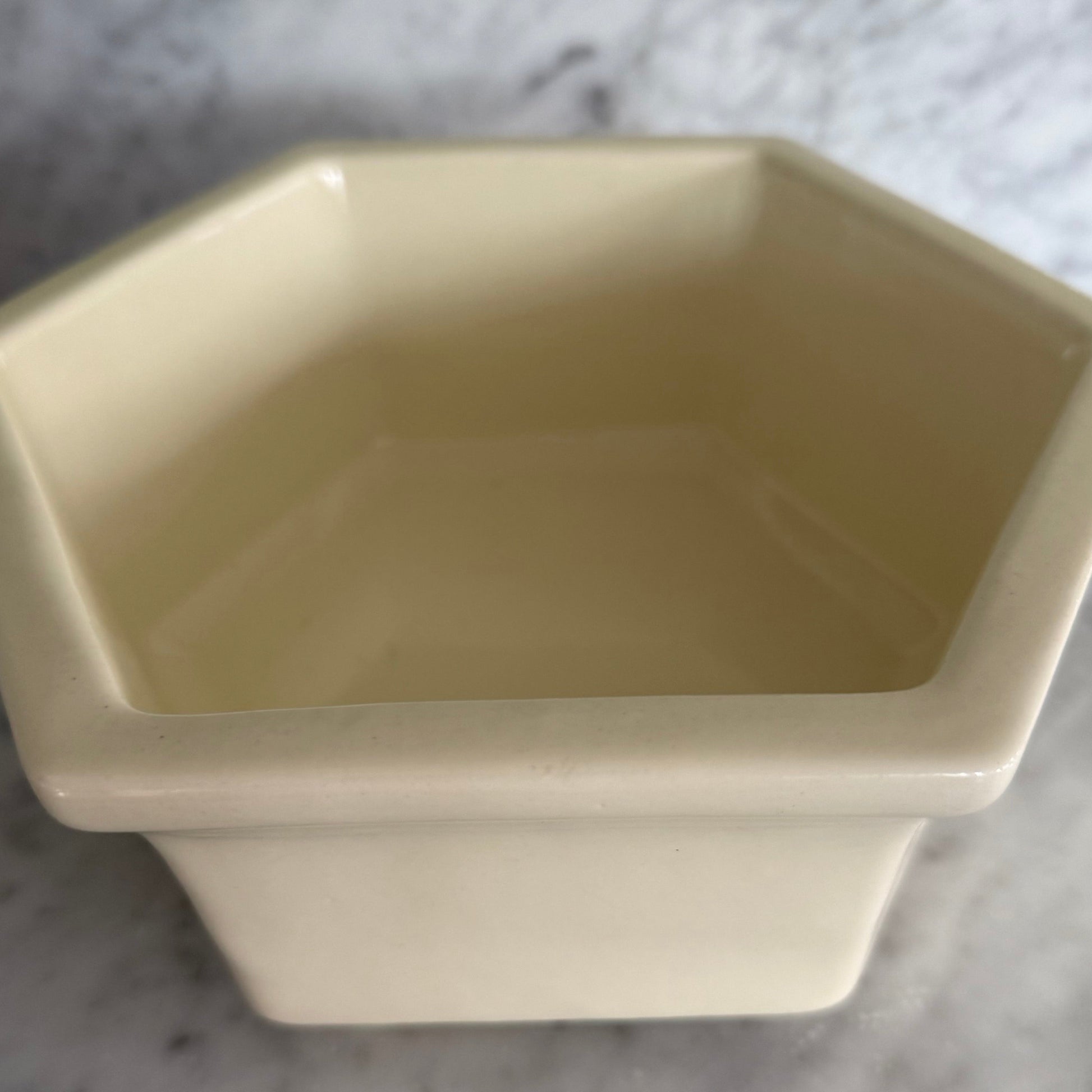 Vintage Haeger Pottery creamy white glazed 6 sided planter. The unique hexagon shape makes this planter extra special. This planter would look great filled with succulents or could even be used for storing other things, such as fruit in the kitchen.