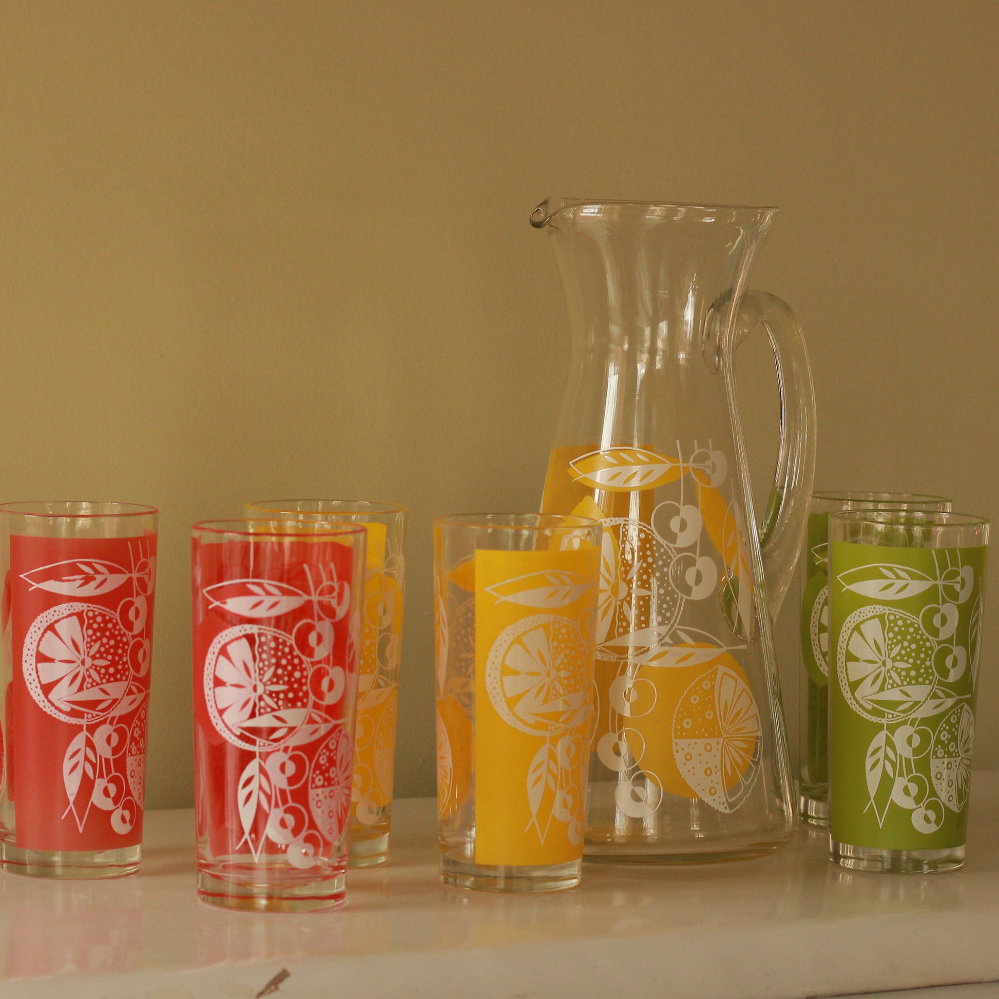 Amazing MCM vintage Juice Carafe and set of 6 juice glass in red, yellow and green. Excellent condition.