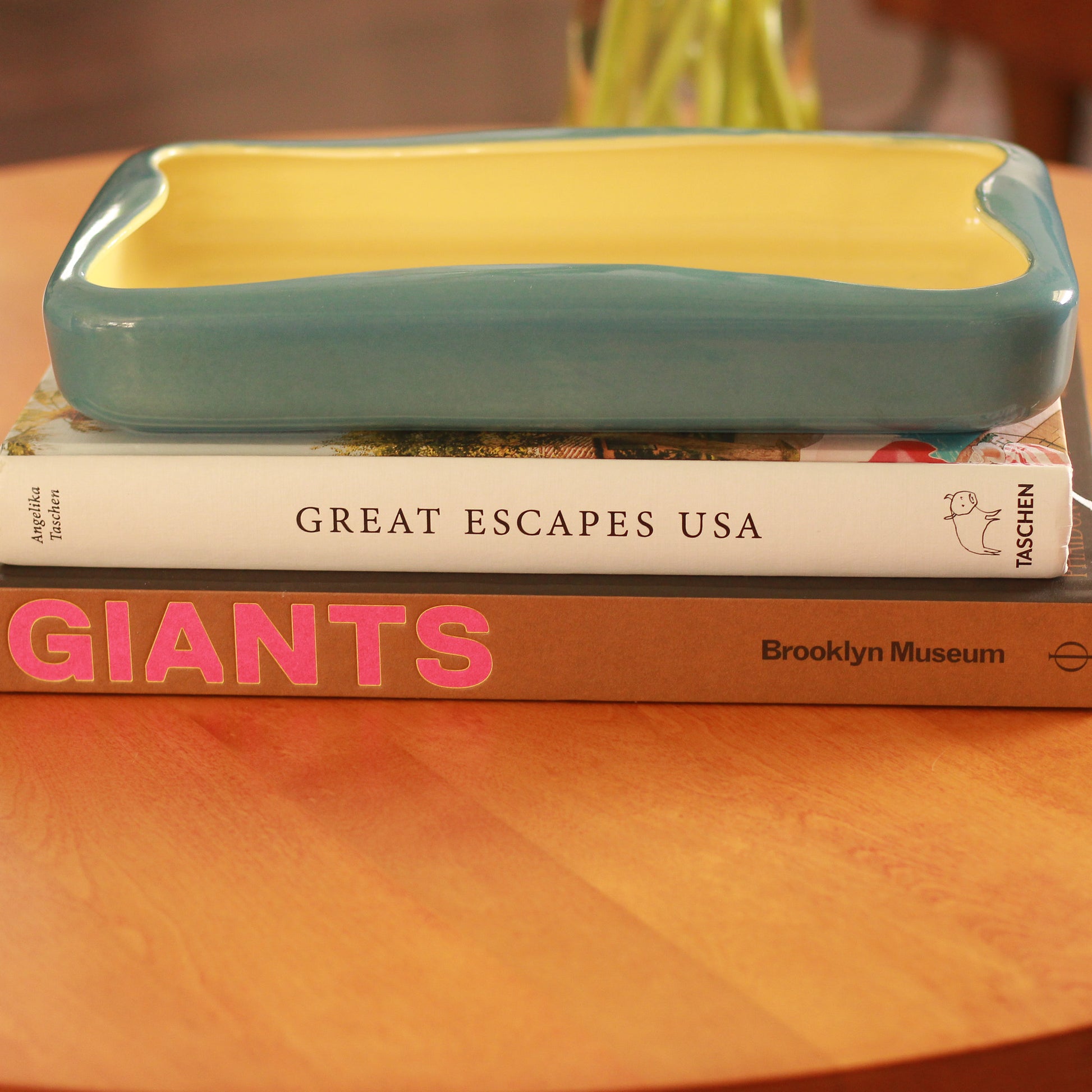 Vintage Red Wing Rectangle Bowl with yellow interior and blue exterior. In excellent condition.