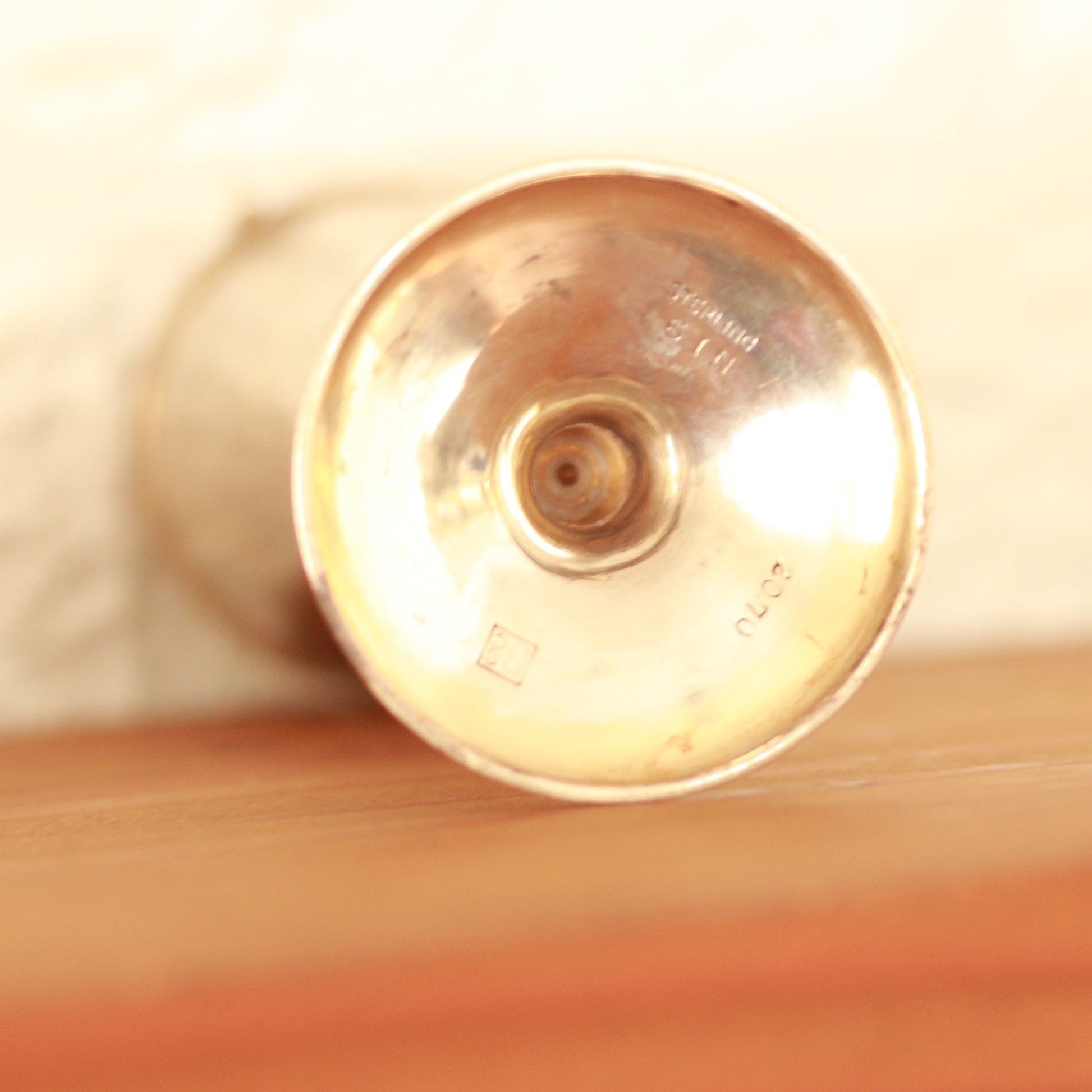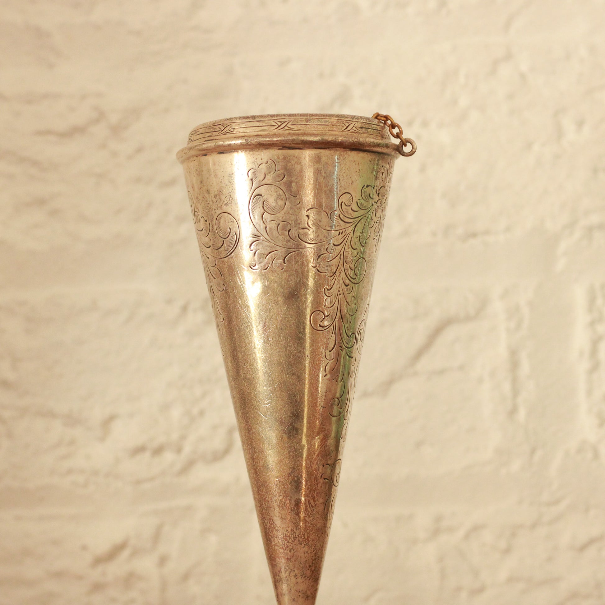 Beautiful silver fluted flower vase with a chain and pin to hold a flower in place. Marked Sterling 6 IN, 2070. In good condition with wear due to age.