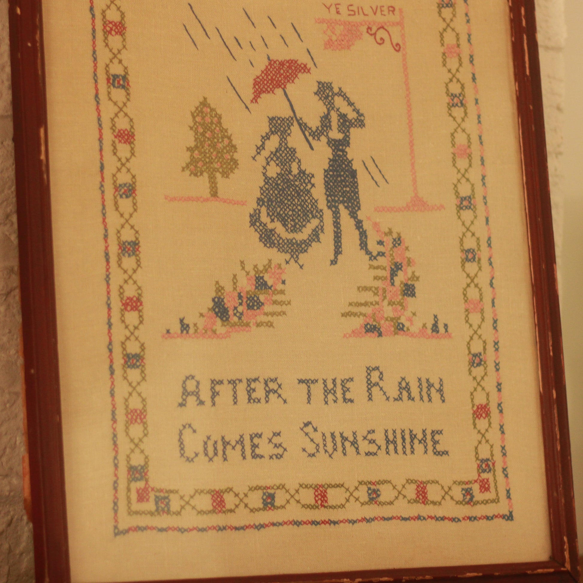 Vintage framed needlework with "After the Rain Comes Sunshine" and couple under an umbrella. Paint on frame is chipped, adding to the character. In good used condition.