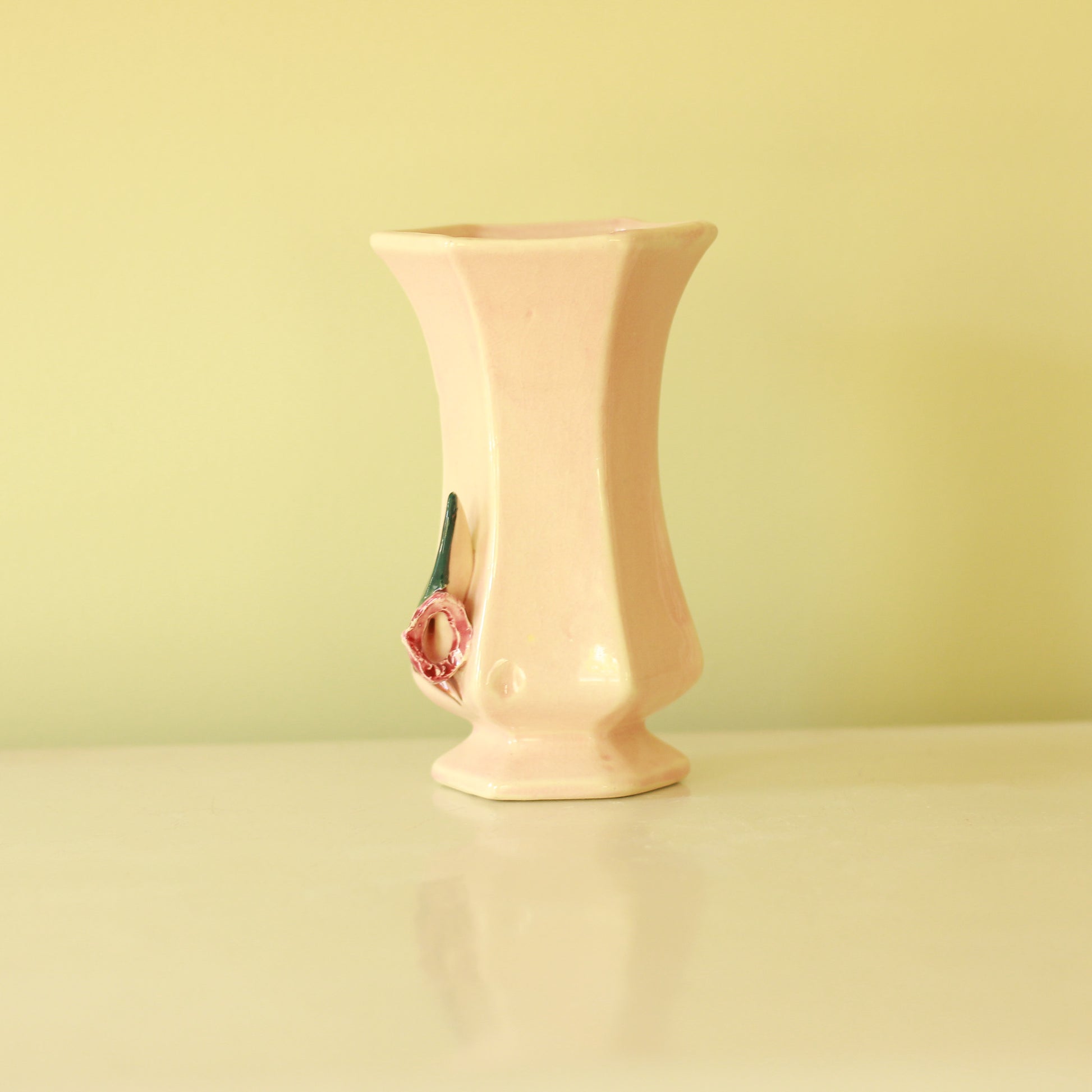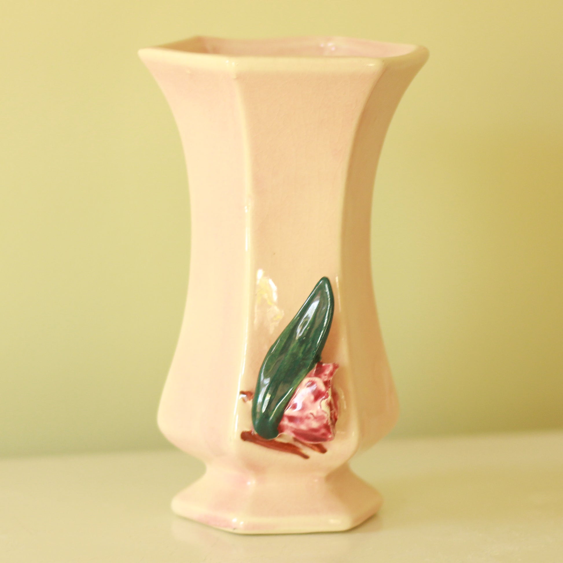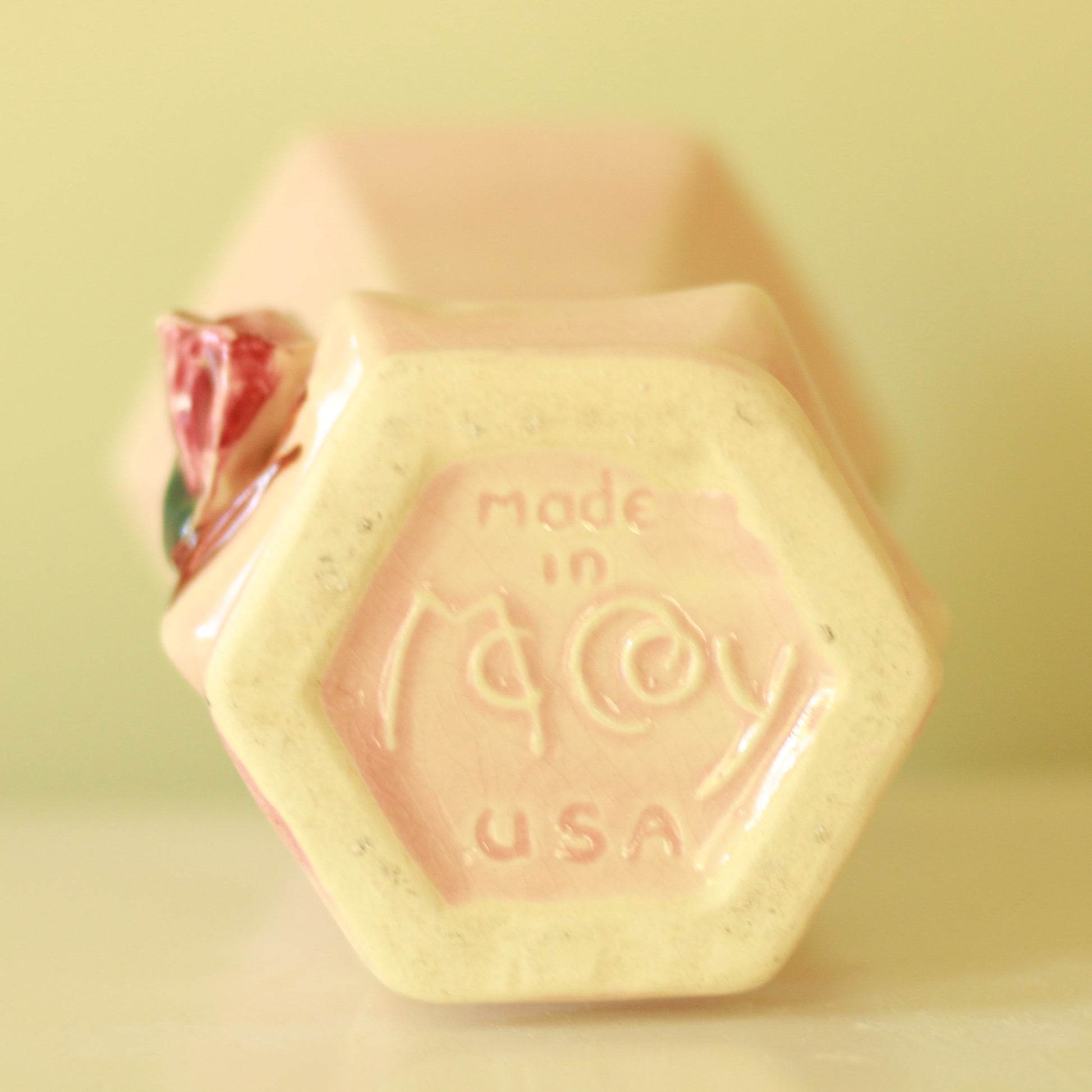 Cute vintage McCoy yellow vase with rose pattern in good condition with some normal wear due to age.