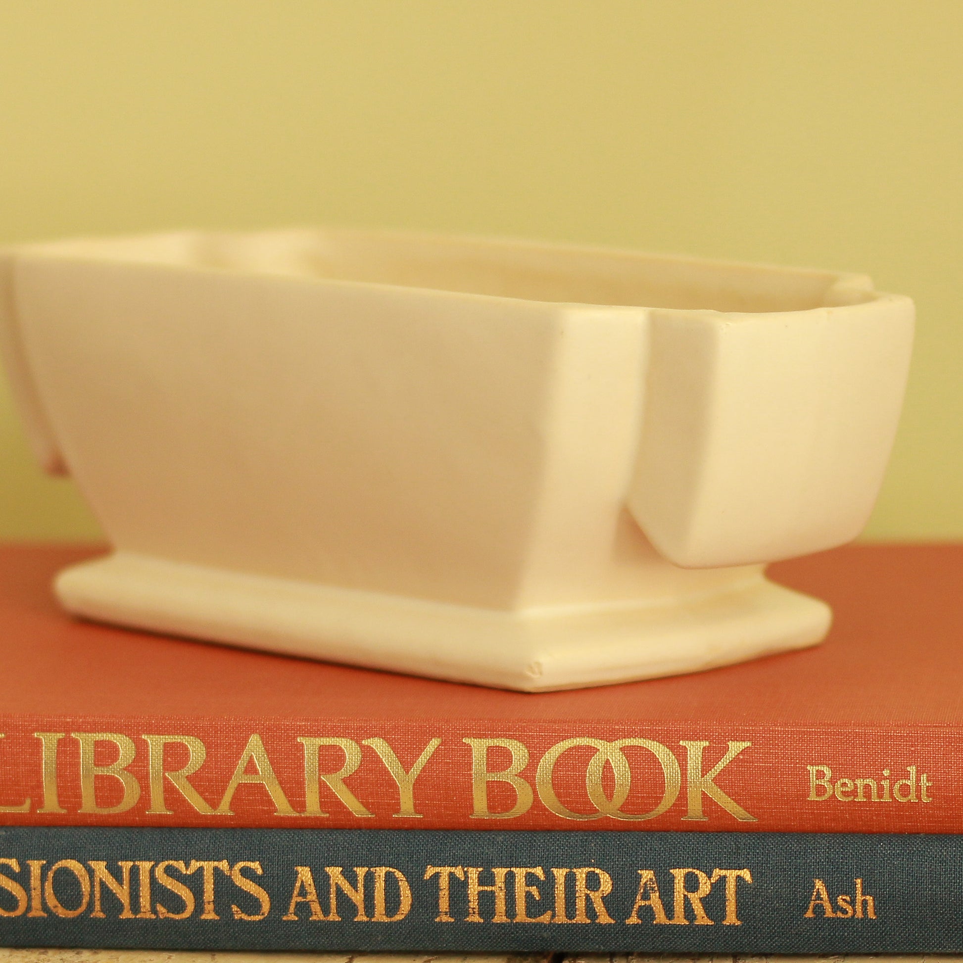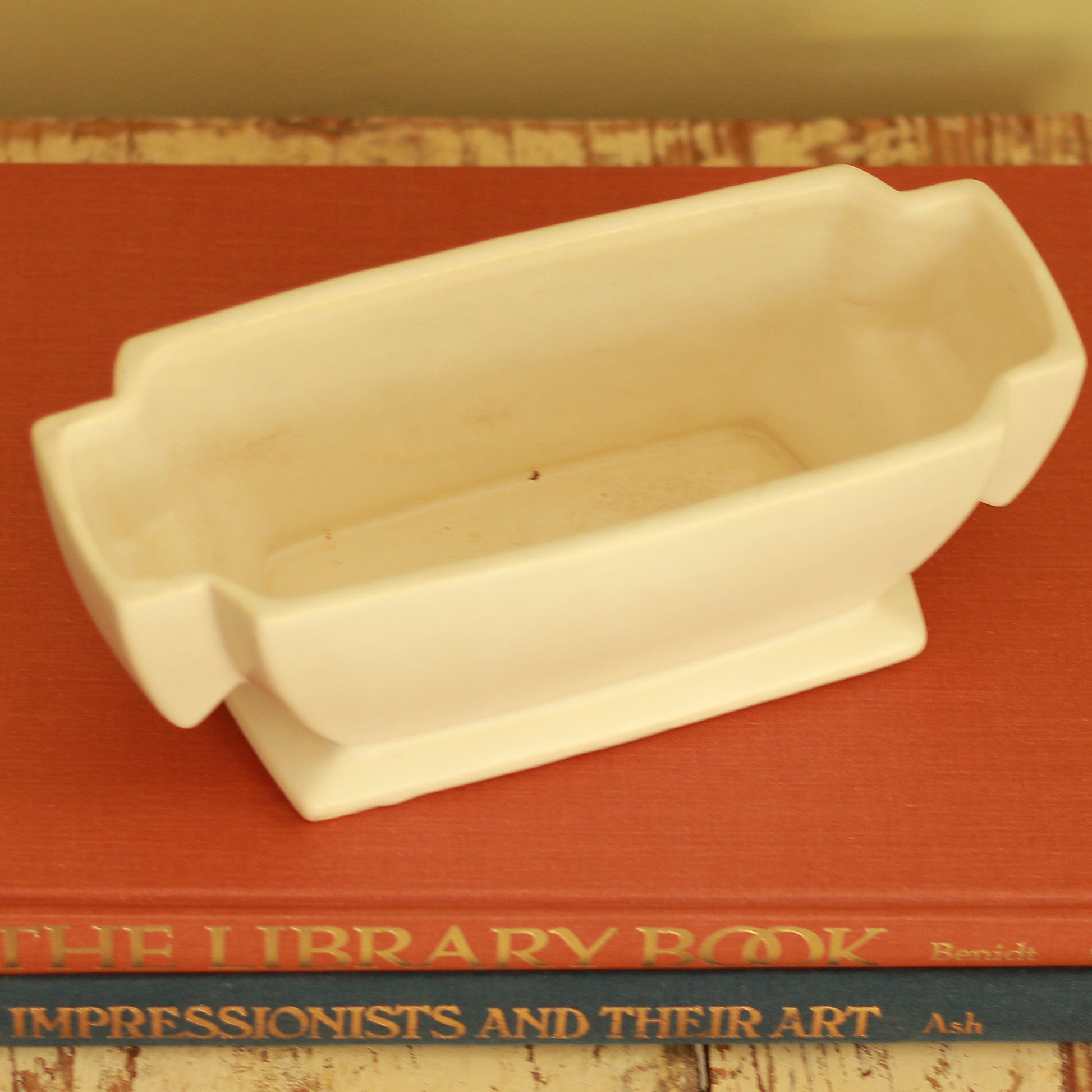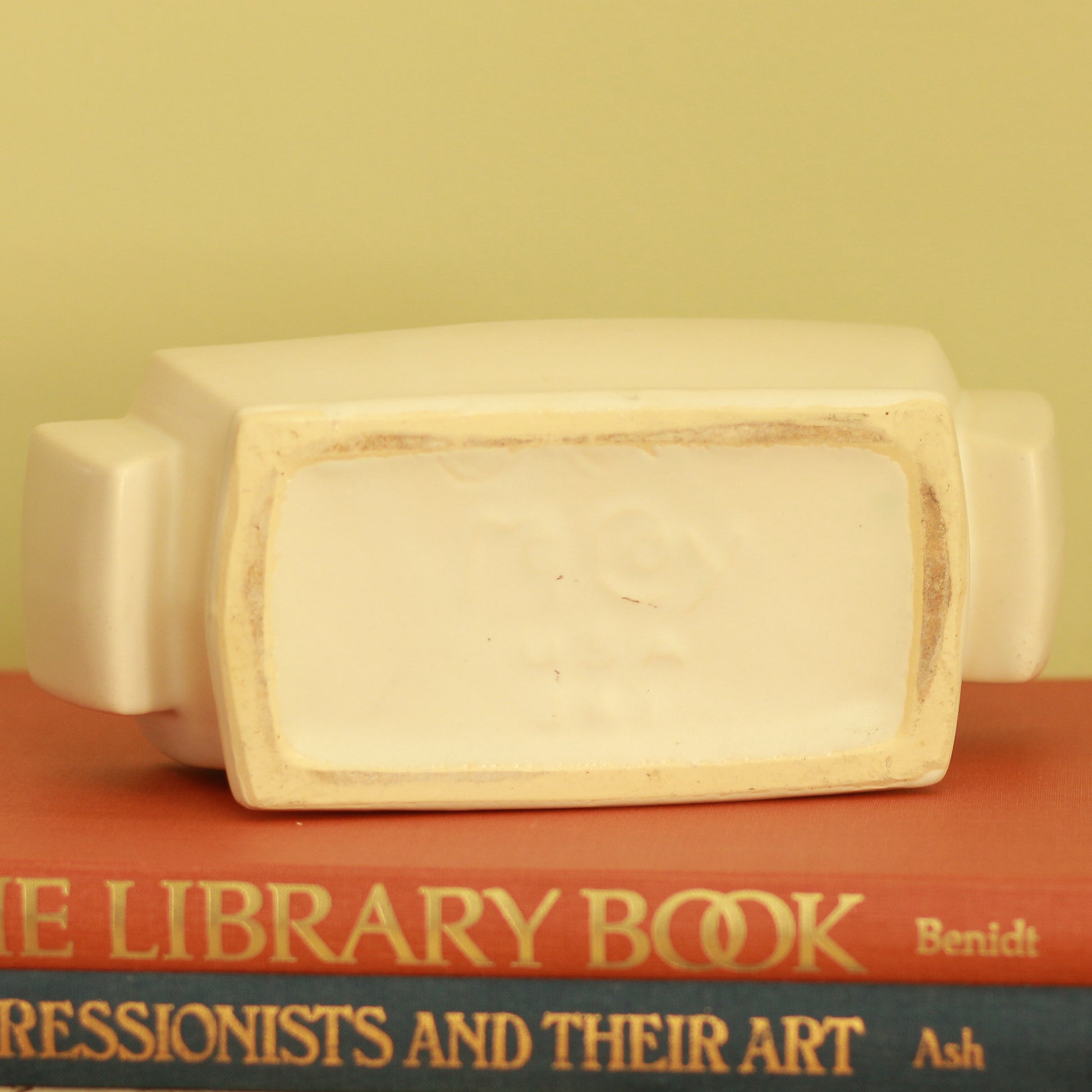 Cute vintage McCoy rectangular, matte white planter, part of the Garden Club line marked McCoy #341. In good condition with some wear and markings due to age.