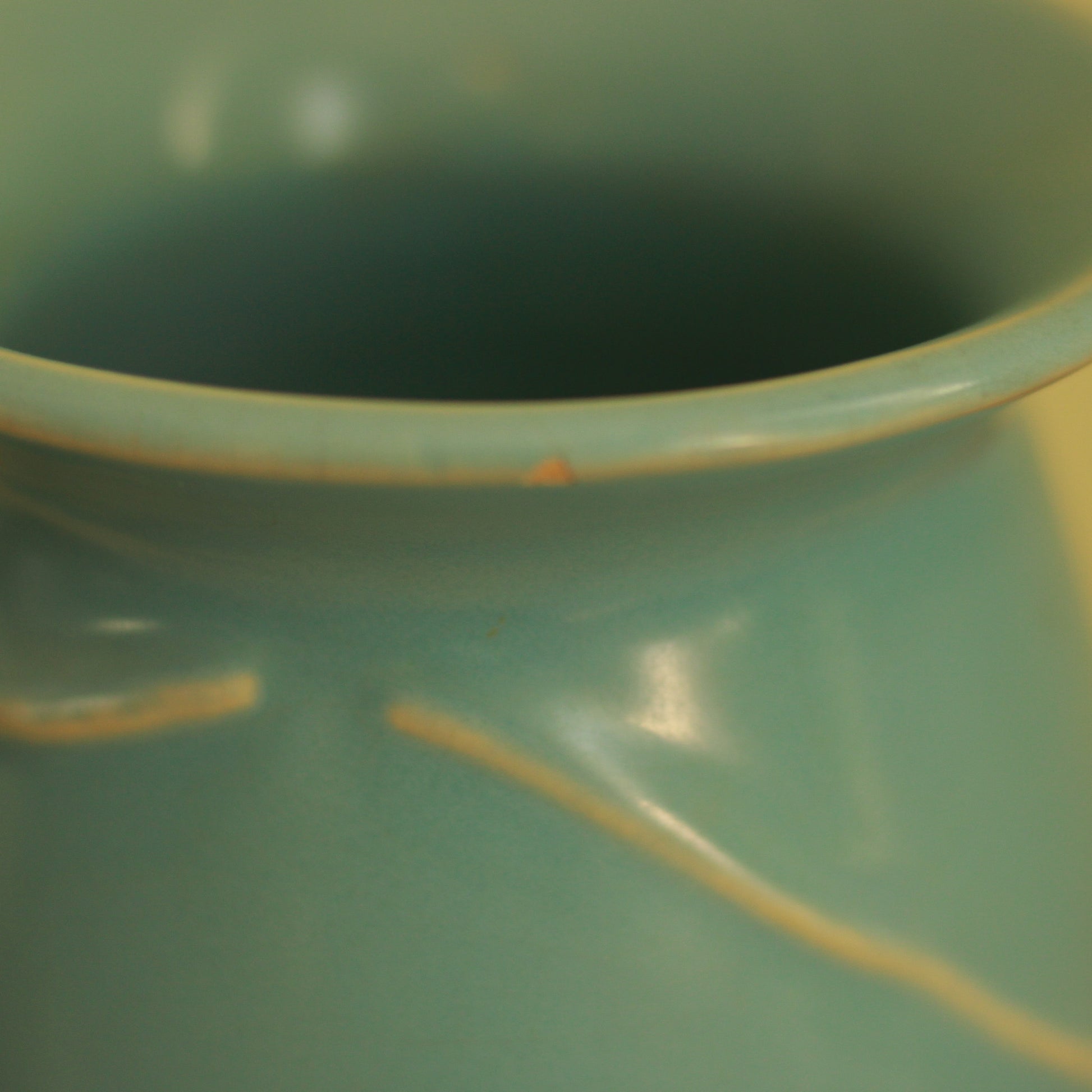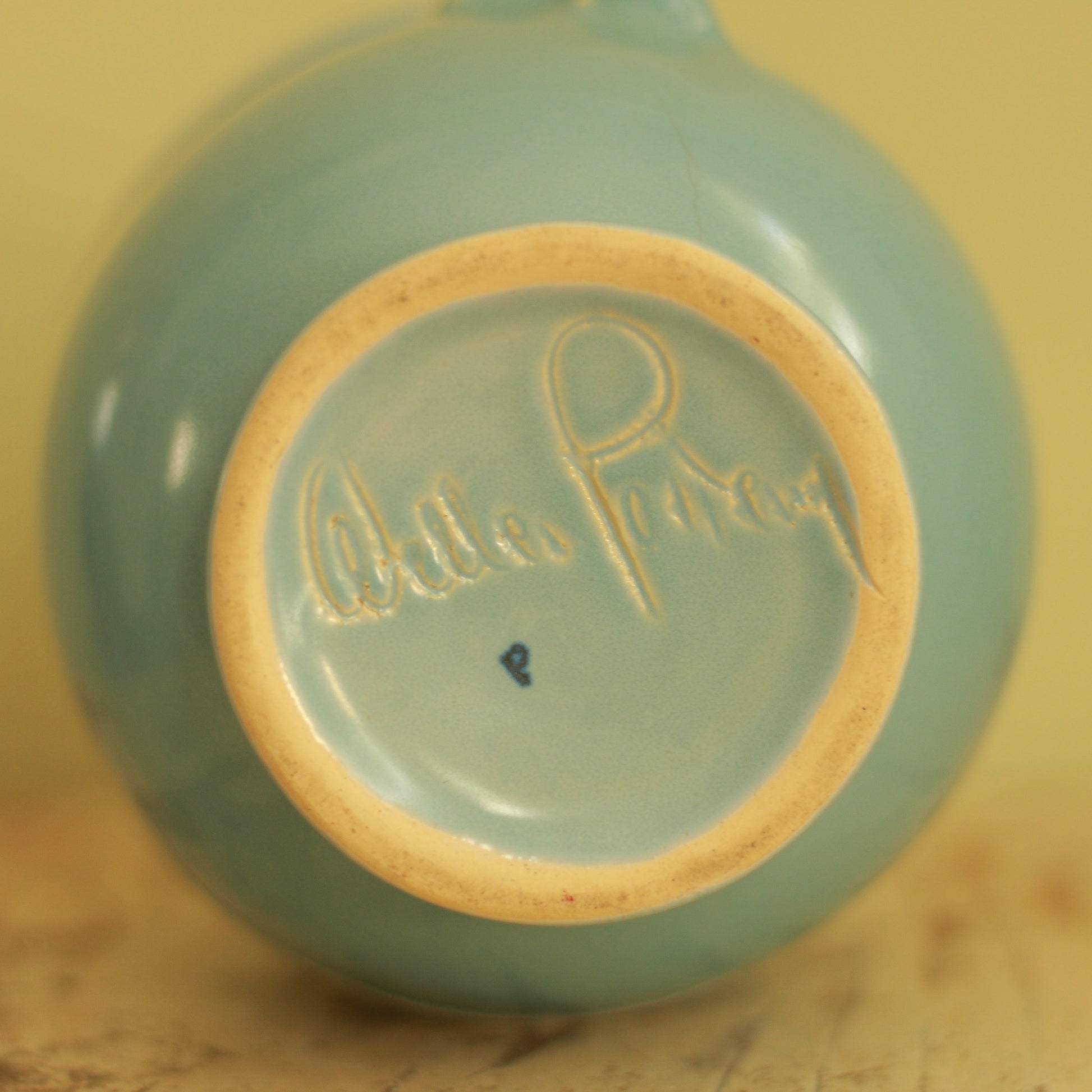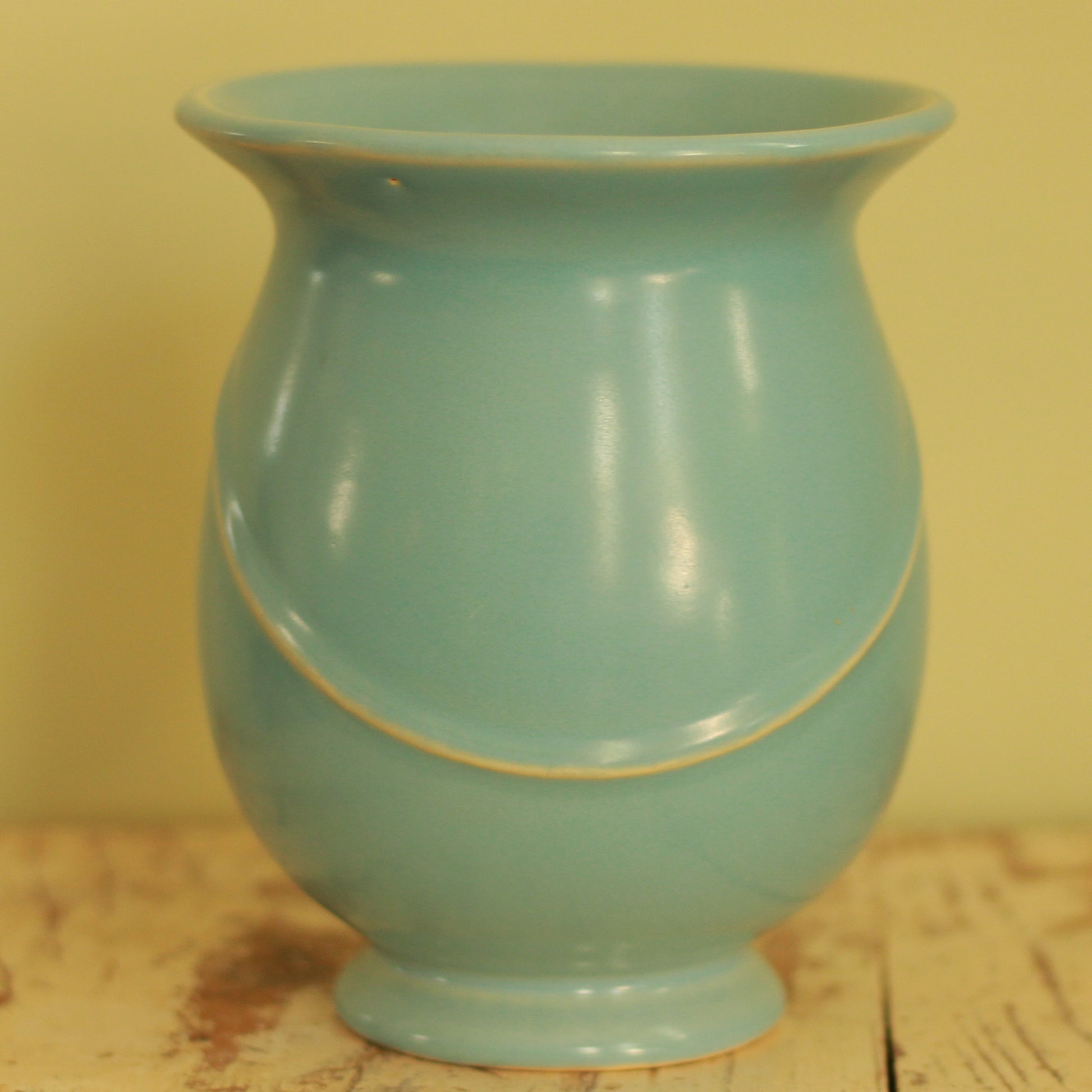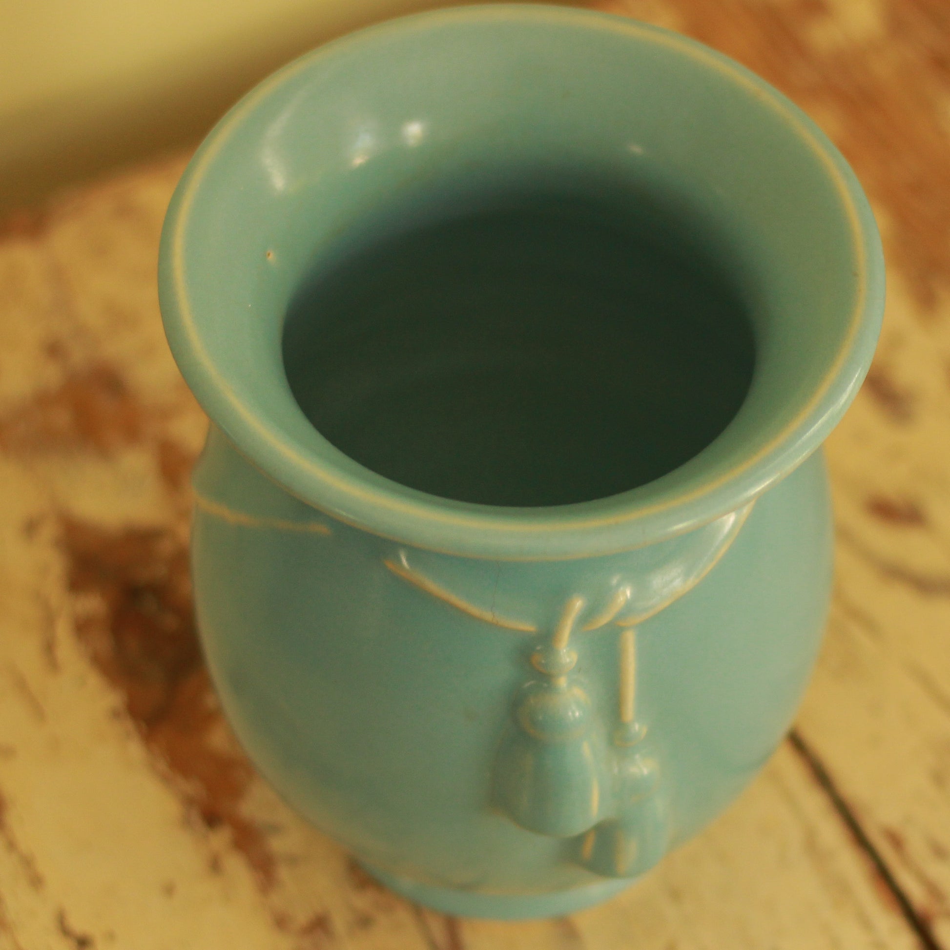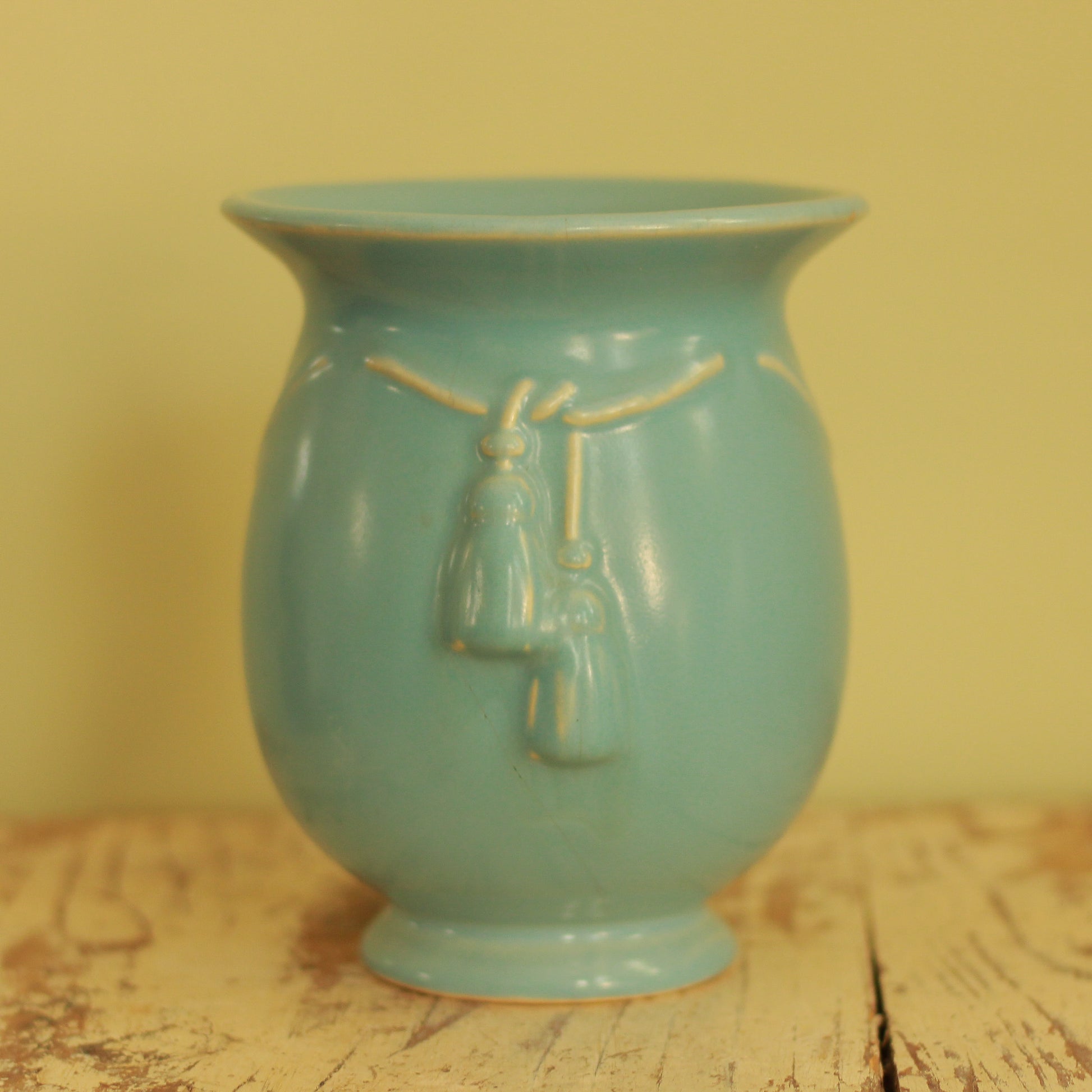 Classic vintage Weller vase in light blue from the Darsie line and featuring a cord and tassel design. In excellent condition with one small nick on rim (see photos).